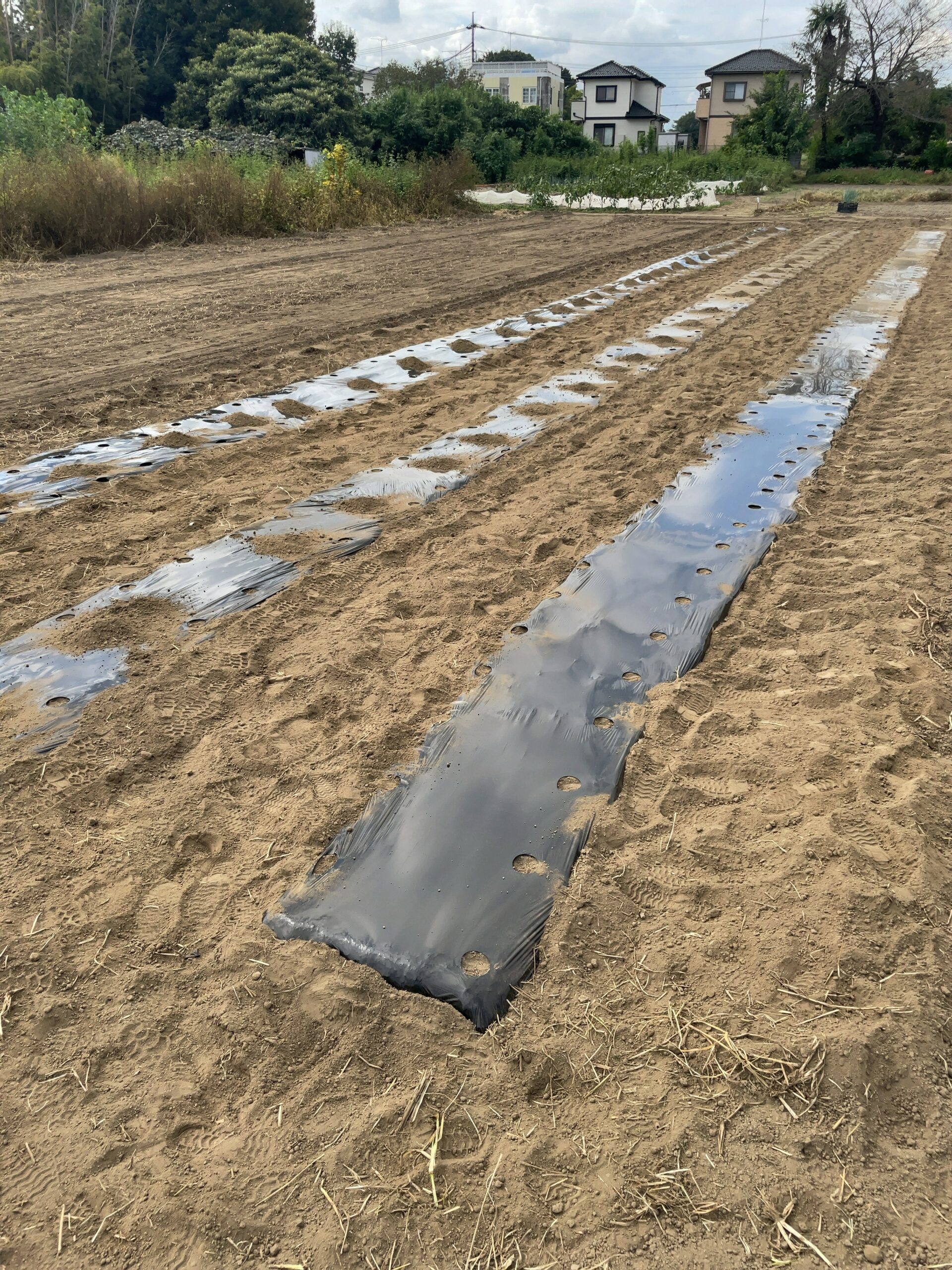 土作りを行い、マルチシートを敷き、大根の種を蒔きました☺