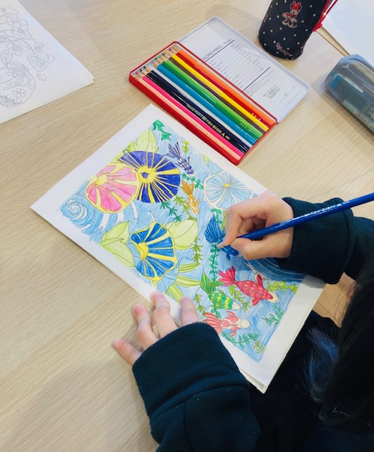 今日は、マインドフルネスとして、みんなで塗り絵をしました。私たちは常に頭の中で色々なことを考えていますが、この時間だけは一旦考えることをやめて、色を塗ることにだけ意識を向けます。 複数の色を重ねてみたり、色鉛筆を立てたり寝かせたりしながら色の濃淡を工夫してみたりと、楽しみながら塗り絵をしていました。 素敵な作品がたくさんできてきたので、今後事業所内に飾りたいと思っています! 午後は、桜を見に行きました。「青い空、ピンクの桜、黄色の菜の花」のコントラストがとてもきれいでした! -