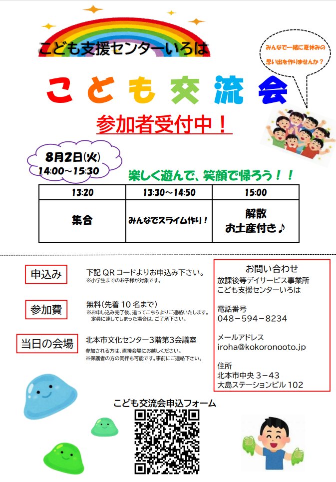 こども支援センターいろは地域イベント『こども交流会』開催予定♪日時:8月2日(火) 14:00~15:30場所:北本市文化センター内容:地域の子どもたちといろはの子どもたちでスライム作り(お土産付き)みんなで夏休みの思い出を作りましょう!!!参加希望の方はQRコードよりお申し込みください!※小学生までのお子様が対象です。お問い合わせだけでも大歓迎です!