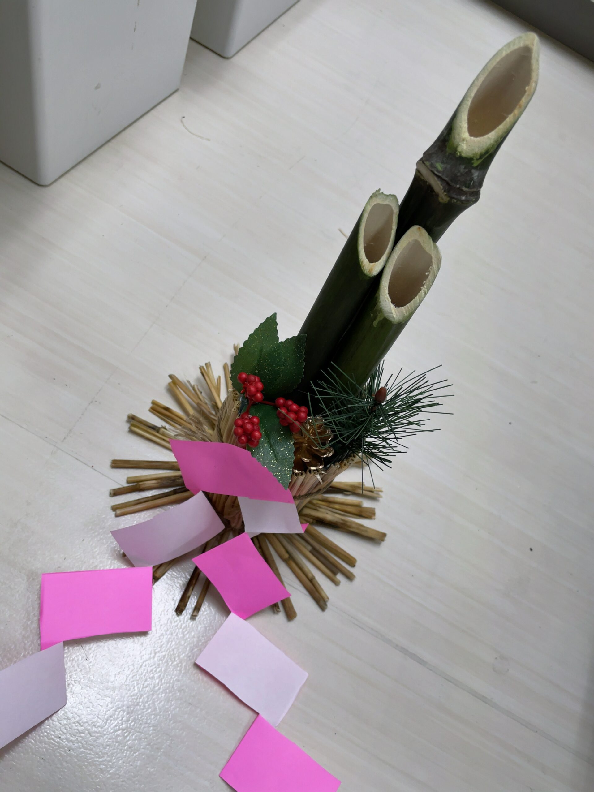 今月の創作は、門松制作🎍 見本を見て、制作開始〜🤔 ワラを切って、隙間なく並べていきます✂️ 飾りも、自分達で作ります✨ 竹をヤスリで磨いていきます🤗 組み立て、飾りを付けたら完成‼️ 今年は、本格的な門松が出来ました👏 お家に飾ってね😊 -