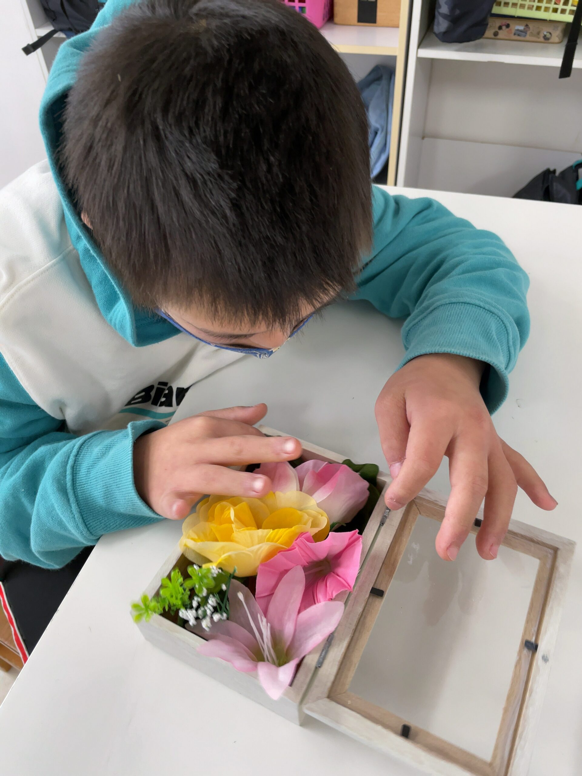 勤労感謝の日🎌 ありがとうの気持ちを込めて、フラワーBOXを作りました🌸 お花の配置を決めて、グルーガンで貼り付け📌 カードを書いたら、完成です🤗 午後は公園にお出かけしたよ🎶 -