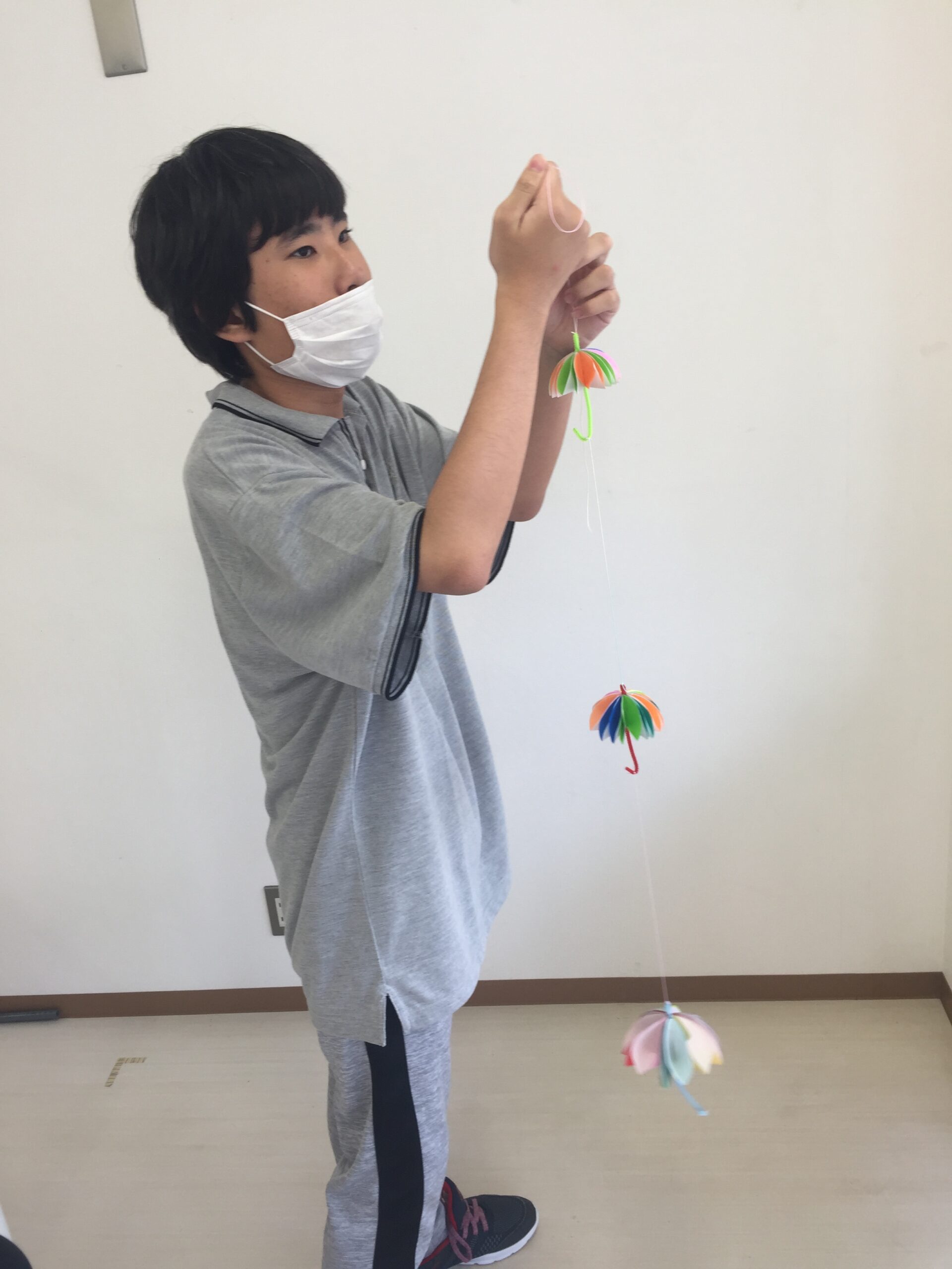 こんにちは。 本日の土曜日活動は「傘モビール」制作✂️ お皿を使って、丸型に成形していきます✏️ 丸く切った折り紙を四つ折りに👇 丸い紙を折るのって難しいね🌀 のりを使って、貼り付けていきます。 12枚を重ねて貼っていきます。 向きが大事だね〜と確認しながら、丁寧に貼り合わせていきましょう。 じゃじゃ〜ん‼️ 糸で繋ぎ合わせたら完成☂️ 窓際など風の当たるところに吊るすと風を受けて傘がクルクル回転します😊 梅雨時期に... -