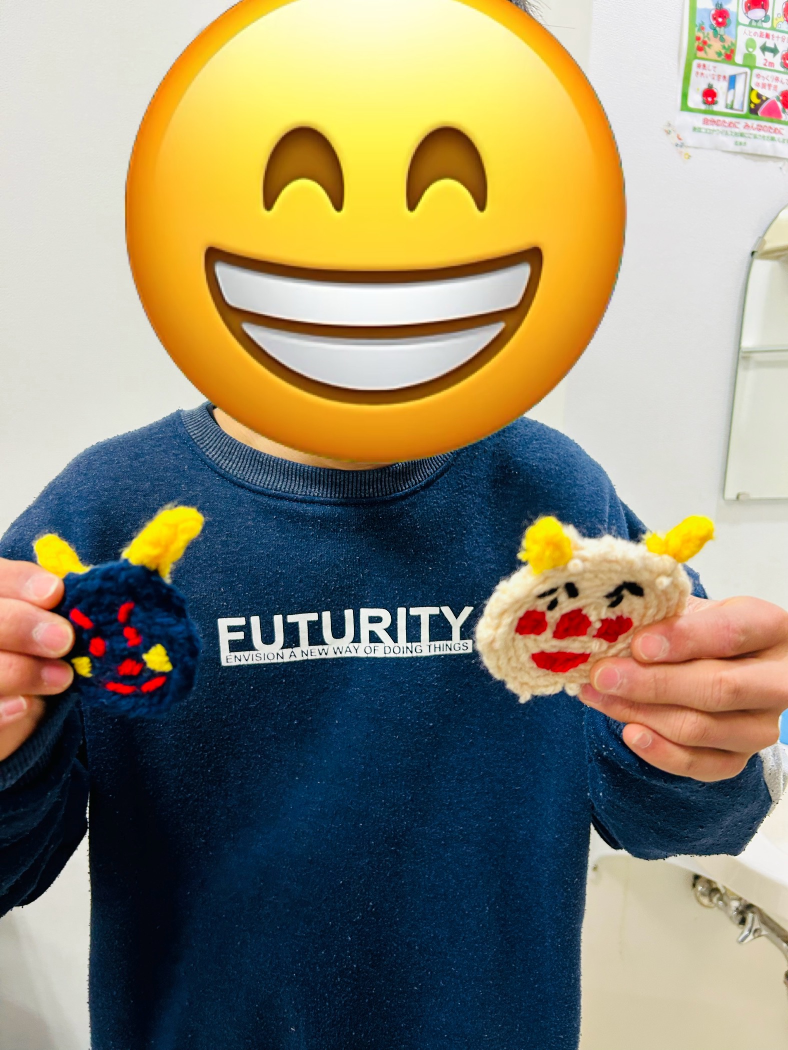 この前新年を迎えたと思ったら、1月ももうあとわずかでビックリです( ゚Д゚)インフルエンザもまだ流行りが終わっていないので、来月も引き続き一致団結で健康を保てるようにがんばりたいと思います♪ そんな今日は創作の『鬼面アクリルたわし』制作の最終日でした!すでに完成して持ち帰っている子どももいますが、今日で無事にみんな完成することができました😊毎年この時期にアクリルたわしを作っているので慣れてきたこともあり、みんな編み込むのがとても上達していました♪顔の部分の刺繍もそれぞれ個性...