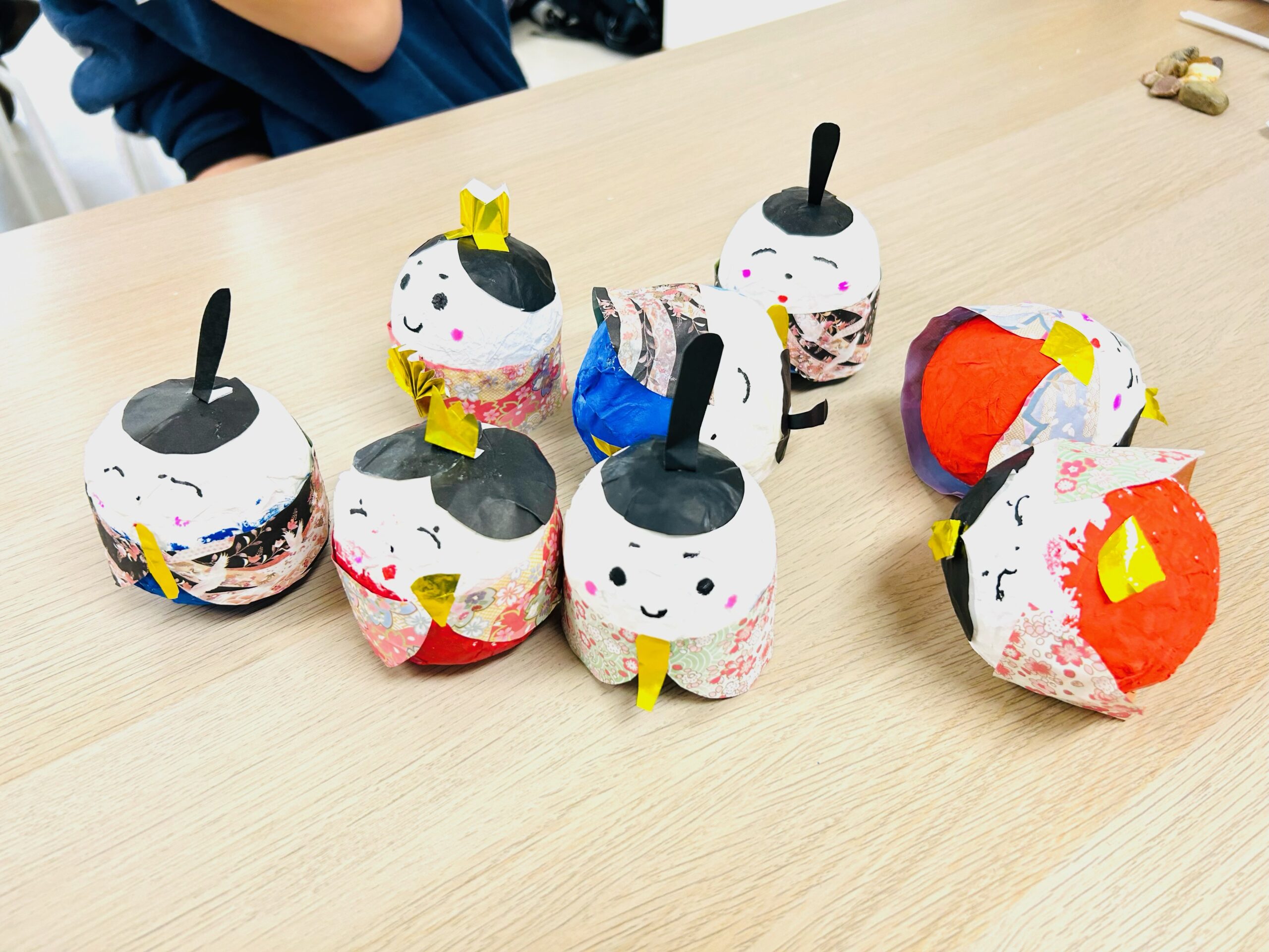 気温も暖かく過ごしやすい一日でしたね♪少しずつ春が見えてきたのでしょうか、あと1ヶ月ぐらいすれば桜も咲き始めていきその後はお花見シーズンです😊春が待ち遠しいですね♪ 昨日は昔あそびのカルタで盛り上がりましたが、本日の活動はみんな大好き創作の『ひな人形制作』で集中した活動でした(^^)/今回、お雛様とお内裏様のセットで完成予定で和紙の貼り付けが終わった子どもは着物のインナー部分を絵具で色塗りや、折り紙で髪の部分を作っていきました♪ 今回のひな人形制作はガチャガチャのカプセルを使... -