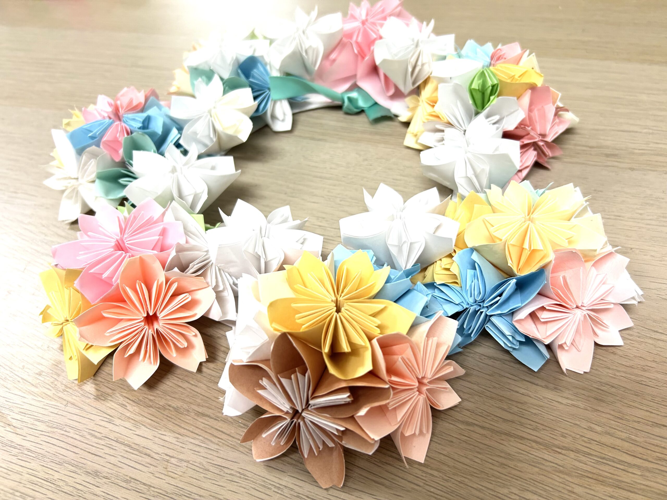 いつもブログを見て頂き、ありがとうございます😊 3月の創作は「桜リース」 一足お先に、満開です🌸 折り紙で丁寧に折り進めて行きます。細かい作業を繰り返します❣️ 台紙にバランス良く、貼り付けたら完成です💕 -